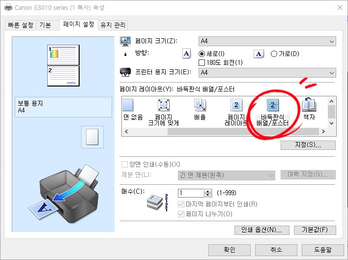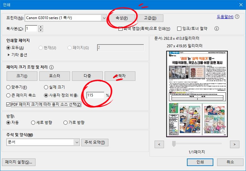 PDF를 열고 출력을 누른 뒤, 인쇄-속성-페이지설정-바둑판식 배열/포스터 설정하고 출력합니다.이때, 조금 더 글씨를 크게 하고 싶다면 사용자정의비율 115%로 설정합니다.