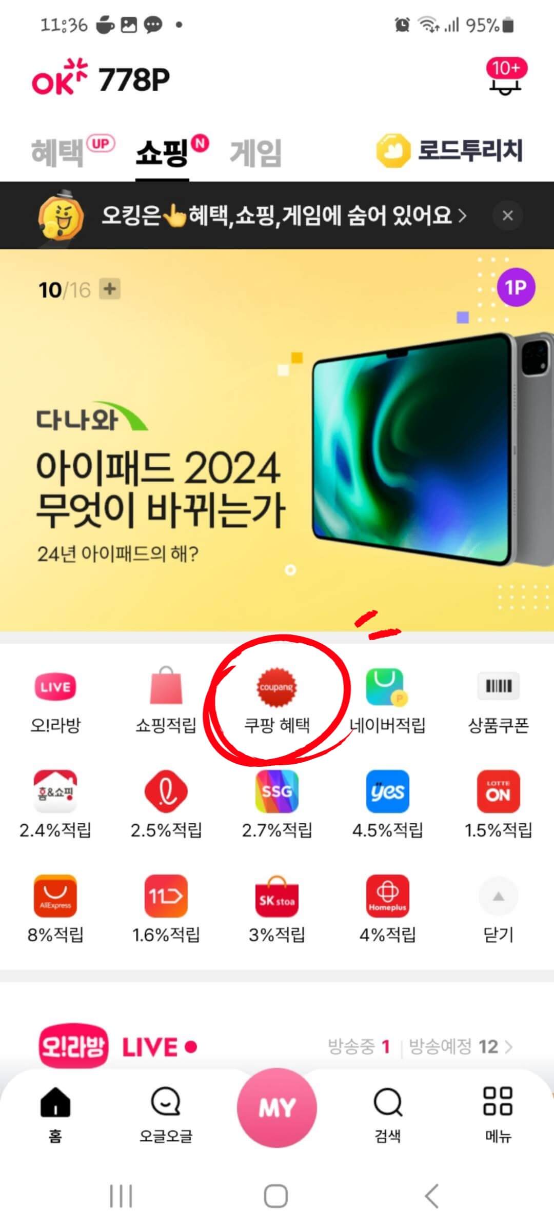 OK Cashbag 앱 > 쿠팡 혜택 > 쿠팡으로 구매하러 가기
