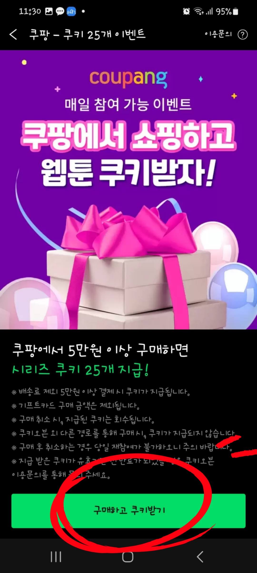 '구매하고 쿠키받기'를 누르고 들어가서 쿠팡에서 구매하면 쿠키 지급이 완료됩니다.